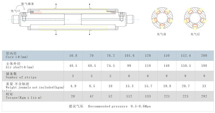 1、通長鍵條式氣脹軸,收放卷都可適用,多氣囊式設(shè)計(jì),氣囊長度與氣脹軸主體相似。
